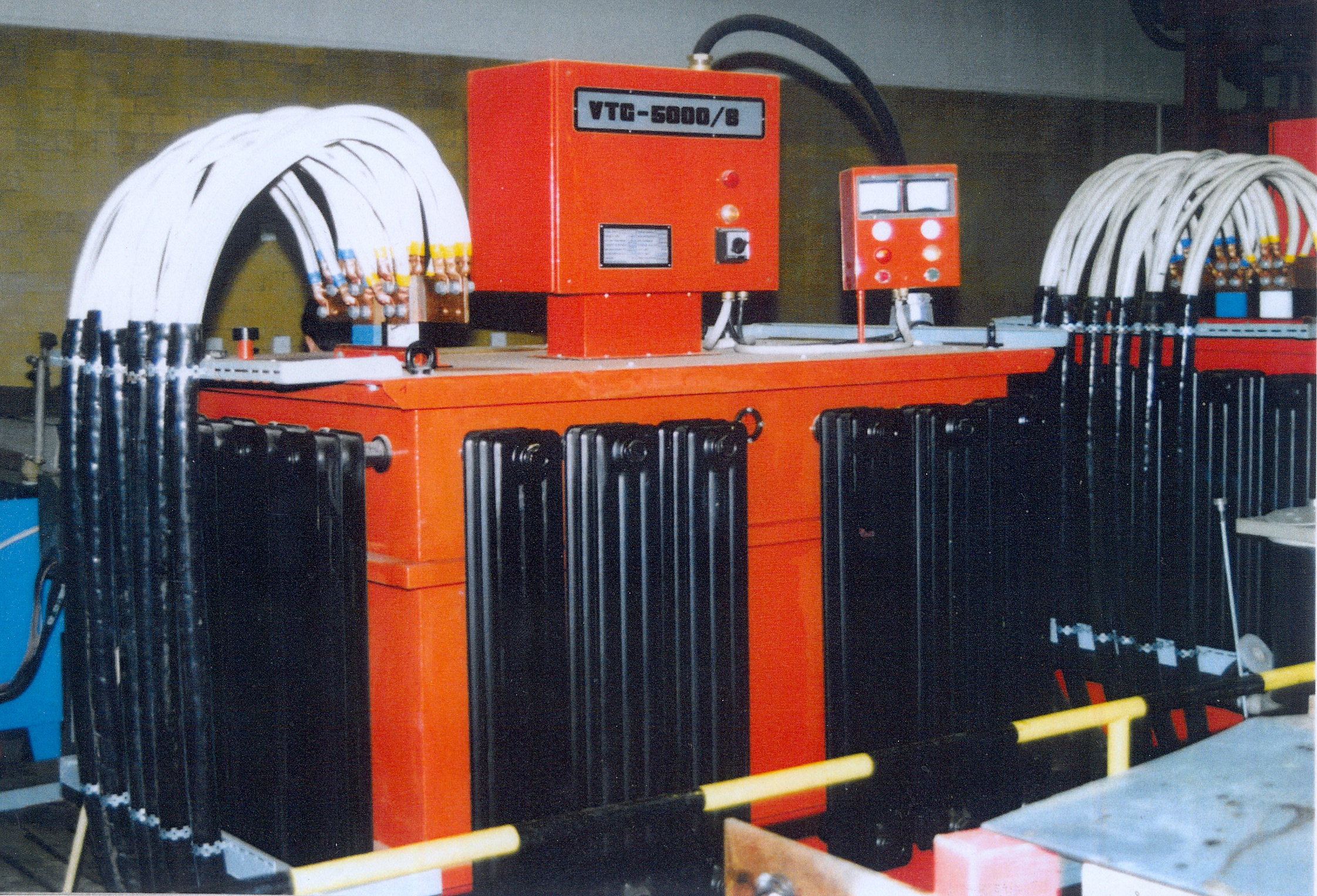 High current elements of rectifiers are oil cooled. The case containing the regulator it is situated on the top of he oil tank. Rectifier part has 2x3-phase, interphase transformer connection. 3–phase tyristor chopper connected before the transformer’s primary coil regulates voltage by current limiting. Power supply’s (photo) nominal output voltage is 8V, nominal DC 5000A. These rectifiers are applicable for other use, e.g. hydrolysis, corrosion control of seaports, etc. (with required U-I parameters).